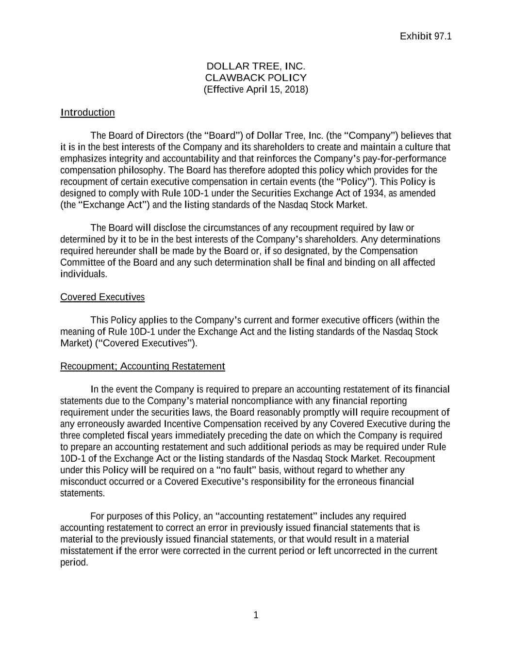 Exhibit 97.1 1 DOLLAR TREE, INC. CLAWBACK POLICY (Effective April 15, 2018) Introduction The Board of Directors (the “Board”) of Dollar Tree, Inc. (the “Company”) believes that it is in the best interests of the Company and its shareholders to create and maintain a culture that emphasizes integrity and accountability and that reinforces the Company’s pay-for-performance compensation philosophy. The Board has therefore adopted this policy which provides for the recoupment of certain executive compensation in certain events (the “Policy”). This Policy is designed to comply with Rule 10D-1 under the Securities Exchange Act of 1934, as amended (the “Exchange Act”) and the listing standards of the Nasdaq Stock Market. The Board will disclose the circumstances of any recoupment required by law or determined by it to be in the best interests of the Company’s shareholders. Any determinations required hereunder shall be made by the Board or, if so designated, by the Compensation Committee of the Board and any such determination shall be final and binding on all affected individuals. Covered Executives This Policy applies to the Company’s current and former executive officers (within the meaning of Rule 10D-1 under the Exchange Act and the listing standards of the Nasdaq Stock Market) (“Covered Executives”). Recoupment; Accounting Restatement In the event the Company is required to prepare an accounting restatement of its financial statements due to the Company’s material noncompliance with any financial reporting requirement under the securities laws, the Board reasonably promptly will require recoupment of any erroneously awarded Incentive Compensation received by any Covered Executive during the three completed fiscal years immediately preceding the date on which the Company is required to prepare an accounting restatement and such additional periods as may be required under Rule 10D-1 of the Exchange Act or the listing standards of the Nasdaq Stock Market. Recoupment under this Policy will be required on a “no fault” basis, without regard to whether any misconduct occurred or a Covered Executive’s responsibility for the erroneous financial statements. For purposes of this Policy, an “accounting restatement” includes any required accounting restatement to correct an error in previously issued financial statements that is material to the previously issued financial statements, or that would result in a material misstatement if the error were corrected in the current period or left uncorrected in the current period.