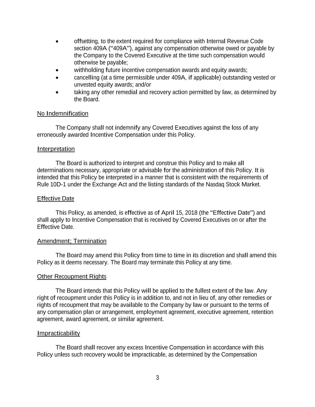 3 • offsetting, to the extent required for compliance with Internal Revenue Code section 409A (“409A”), against any compensation otherwise owed or payable by the Company to the Covered Executive at the time such compensation would otherwise be payable; • withholding future incentive compensation awards and equity awards; • cancelling (at a time permissible under 409A, if applicable) outstanding vested or unvested equity awards; and/or • taking any other remedial and recovery action permitted by law, as determined by the Board. No Indemnification The Company shall not indemnify any Covered Executives against the loss of any erroneously awarded Incentive Compensation under this Policy. Interpretation The Board is authorized to interpret and construe this Policy and to make all determinations necessary, appropriate or advisable for the administration of this Policy. It is intended that this Policy be interpreted in a manner that is consistent with the requirements of Rule 10D-1 under the Exchange Act and the listing standards of the Nasdaq Stock Market. Effective Date This Policy, as amended, is effective as of April 15, 2018 (the “Effective Date”) and shall apply to Incentive Compensation that is received by Covered Executives on or after the Effective Date. Amendment; Termination The Board may amend this Policy from time to time in its discretion and shall amend this Policy as it deems necessary. The Board may terminate this Policy at any time. Other Recoupment Rights The Board intends that this Policy will be applied to the fullest extent of the law. Any right of recoupment under this Policy is in addition to, and not in lieu of, any other remedies or rights of recoupment that may be available to the Company by law or pursuant to the terms of any compensation plan or arrangement, employment agreement, executive agreement, retention agreement, award agreement, or similar agreement. Impracticability The Board shall recover any excess Incentive Compensation in accordance with this Policy unless such recovery would be impracticable, as determined by the Compensation