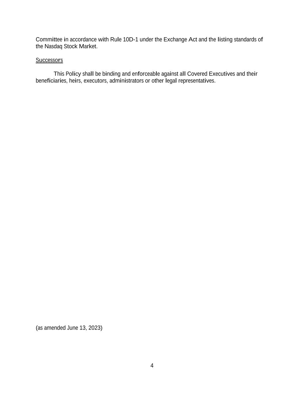 4 Committee in accordance with Rule 10D-1 under the Exchange Act and the listing standards of the Nasdaq Stock Market. Successors This Policy shall be binding and enforceable against all Covered Executives and their beneficiaries, heirs, executors, administrators or other legal representatives. (as amended June 13, 2023)