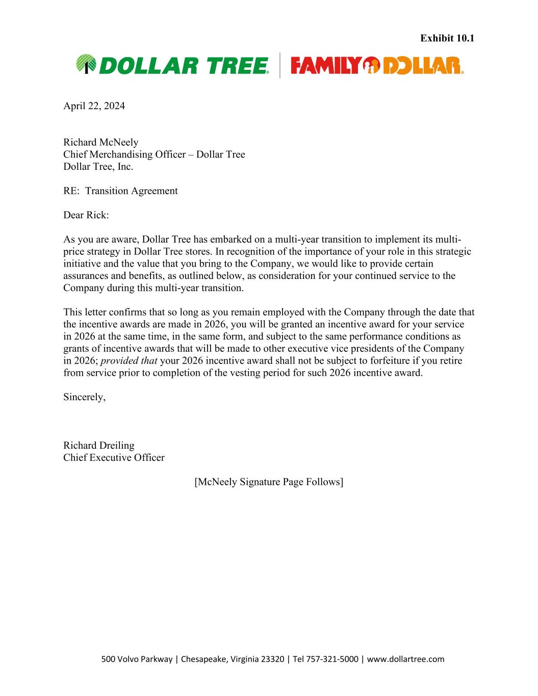 Exhibit 10.1 500 Volvo Parkway | Chesapeake, Virginia 23320 | Tel 757-321-5000 | www.dollartree.com April 22, 2024 Richard McNeely Chief Merchandising Officer – Dollar Tree Dollar Tree, Inc. RE: Transition Agreement Dear Rick: As you are aware, Dollar Tree has embarked on a multi-year transition to implement its multi- price strategy in Dollar Tree stores. In recognition of the importance of your role in this strategic initiative and the value that you bring to the Company, we would like to provide certain assurances and benefits, as outlined below, as consideration for your continued service to the Company during this multi-year transition. This letter confirms that so long as you remain employed with the Company through the date that the incentive awards are made in 2026, you will be granted an incentive award for your service in 2026 at the same time, in the same form, and subject to the same performance conditions as grants of incentive awards that will be made to other executive vice presidents of the Company in 2026; provided that your 2026 incentive award shall not be subject to forfeiture if you retire from service prior to completion of the vesting period for such 2026 incentive award. Sincerely, Richard Dreiling Chief Executive Officer [McNeely Signature Page Follows]