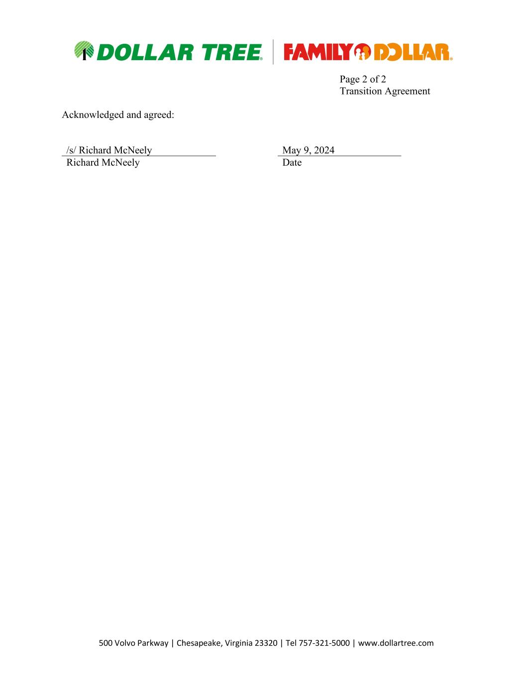 500 Volvo Parkway | Chesapeake, Virginia 23320 | Tel 757-321-5000 | www.dollartree.com Page 2 of 2 Transition Agreement Acknowledged and agreed: /s/ Richard McNeely May 9, 2024 Richard McNeely Date
